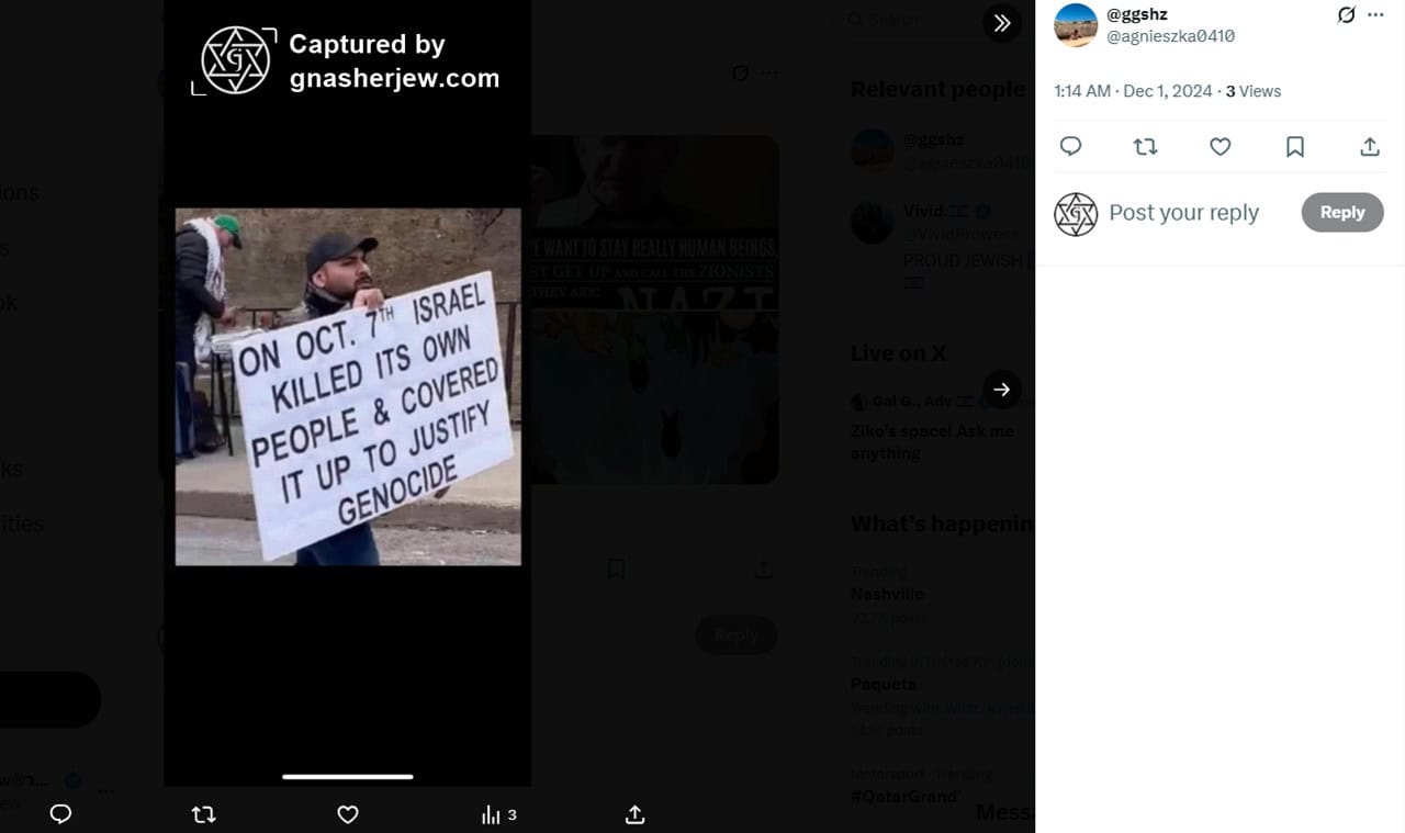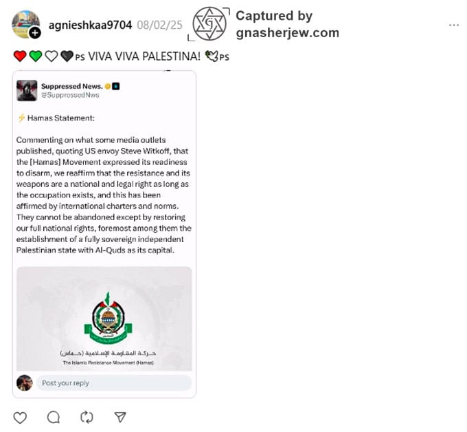 A review of her social media activity revealed that Agnieszka Kijowska consistently shares antisemitic material, denies Hamas’s crimes on October 7, and spreads terrorist propaganda. We include examples of her antisemitism and urge you to report her for hate speech to the Metropolitan Police.