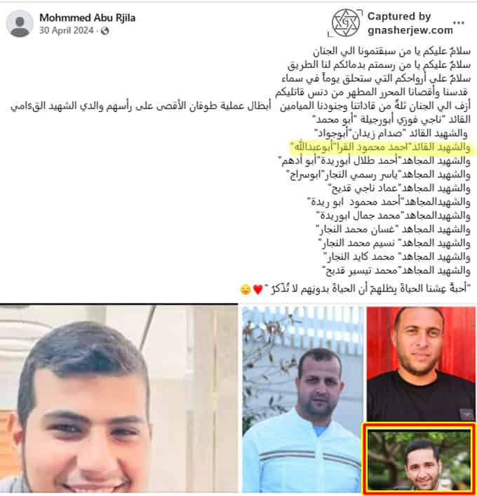 Note: Ahmed Al-Qarra’s brother, Abdullah Al-Qarra (عبدالله القرا), was a militant operative of the al-Qassam Brigades. He was eliminated in April 2011.