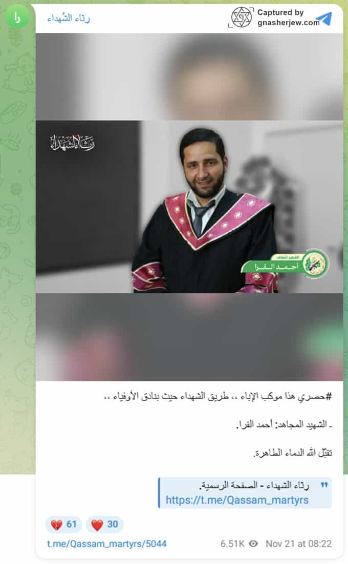 - Death: Ahmed Mahmoud Mohammad Al-Qarra (أحمد محمود محمد القرا) was killed on November 10, 2023, reportedly in a targeted airstrike at the entrance of Khuza’a town, east of Khan Yunis, in the southern Gaza Strip.