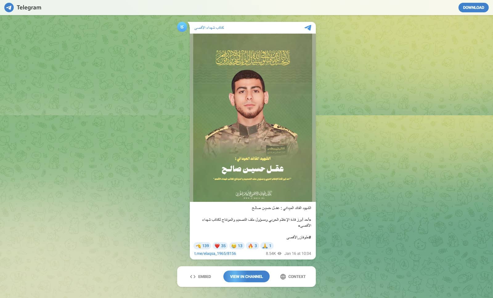 - Death: Aql Hussein Aql Saleh was killed on January 15, 2025, during military operations in in the Al-Shati refugee camp in Gaza City.