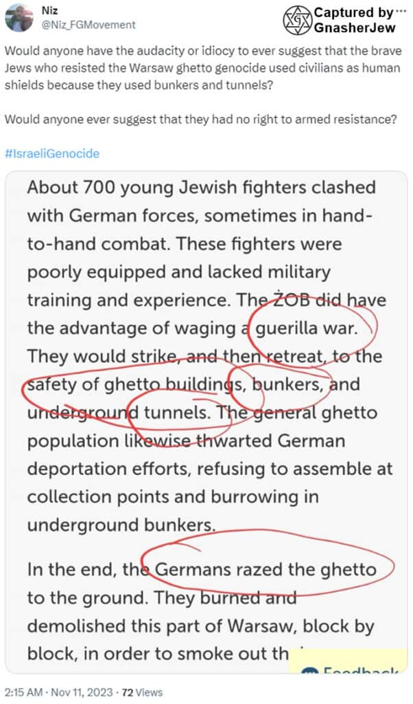Additionally, he compares Hamas’ rape, murder, beheading, and burning alive of innocent civilians to the Jewish rebellion against the Nazis.