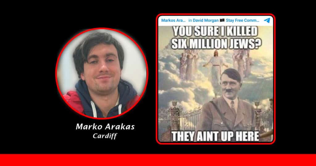 MarkoS (Marko) Arakas is an admin of the far-right hate group ‘David Morgan Stay Free Community’ on Telegram. David Morgan was recently jailed for his antisemitic posts and racial hatred on the social media platform X. MarkoS Arakas also spreads hate against Jews and denies the Holocaust.