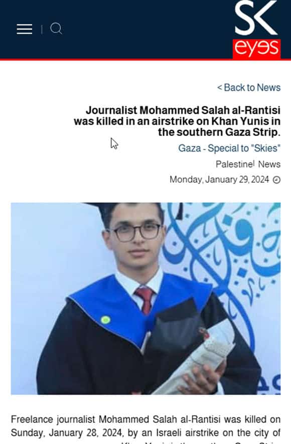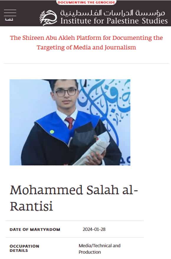 - Journalistic Association: The Institute for Palestine Studies’ Shereen Abu Akleh’s platform for documenting the targeting of media and journalism falsely described Mohammed Salah al-Rantisi as a media professional, technician, and producer. Similarly, Beirut-based SKeyes Center for the Defense of Media and Cultural Freedoms (Samir Kassir Foundation) incorrectly identified him as a freelance journalist. However, contrary to these claims, his bio on social media states that he is a technician, Android application developer, and video editor, and that he is interested in the world of technology and smartphones.