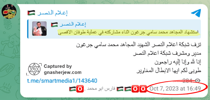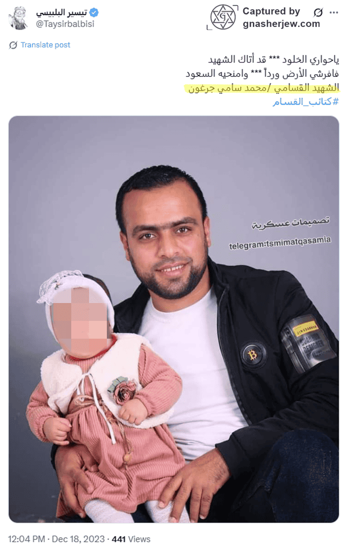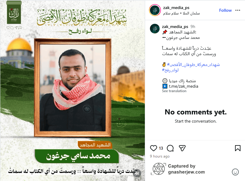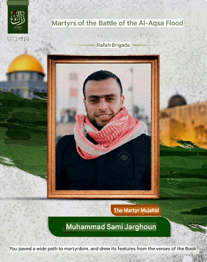 - Militant Affiliation: Muhammad Sami Jarghoun has been recognized in online obituaries and tributes as a brave fighter and hero of the Al-Qassam Rafah Brigade, who participated in the October 7 attacks, referred to by Hamas and other Palestinian armed groups as “Operation Al-Aqsa Flood,” east of Rafah.