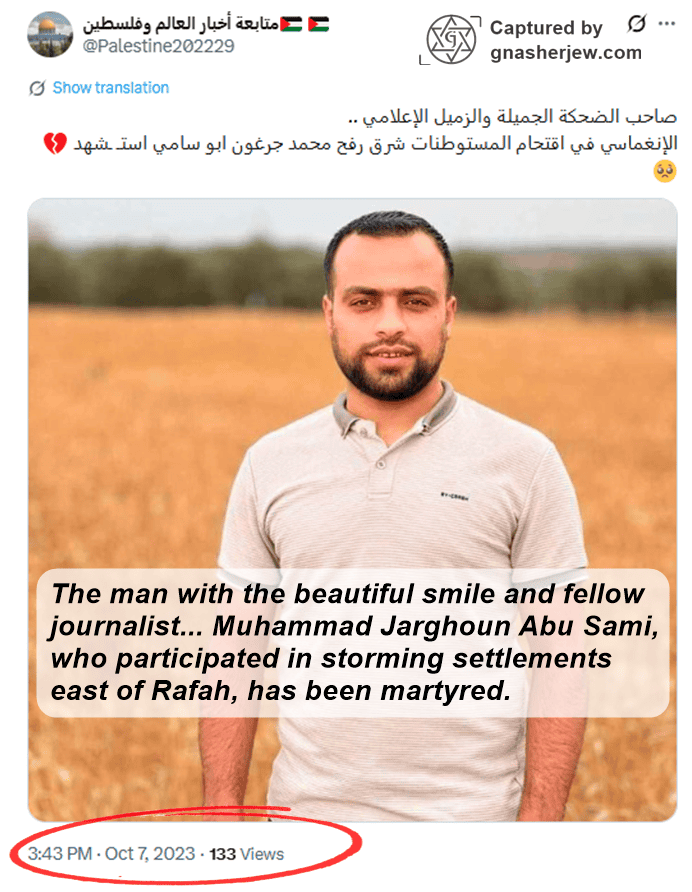 - Death: Muhammad Sami Abdullah Jarghoun (محمد سامي عبد الله جرغون) was killed on October 7, 2023, reportedly by Israeli fire in an area to the east of Rafah city in the southern Gaza Strip.
