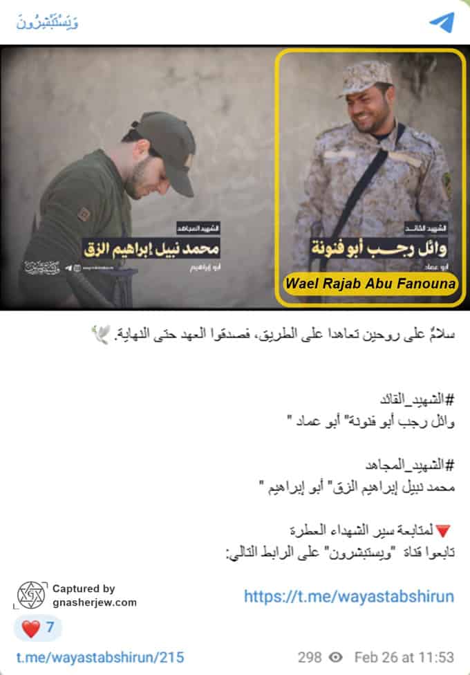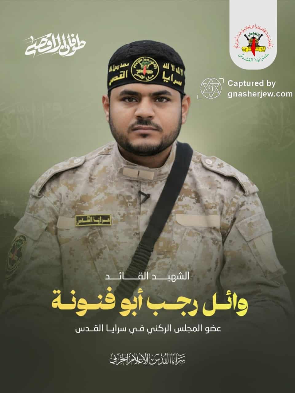 - Militant Affiliation: Avichay Adraee, a Colonel in the Israel Defense Forces (IDF) and head of the Arab media division of the IDF Spokesperson’s Unit, stated that Wael Abu Fanouna was the deputy head of the media system affiliated with the Palestinian Islamic Jihad (PIJ). In October 2025, the PIJ’s armed wing, the Al-Quds Brigades, issued a death notice for several leaders and fighters killed during the ‘Al-Aqsa Flood’ battle, including Wael Abu Fanouna, who was recognized as a Martyr Commander and a member of the Al-Quds Brigades’ general council.
